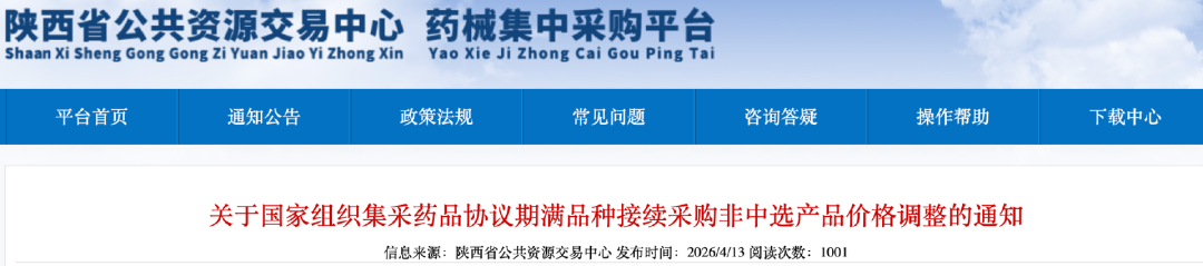 4月13日,陕西省公共资源交易中心发布《关于国家组织集采药品协议期满品种接续采购非中选产品价格调整的通知》,要求中选企业对非中选产品进行价格调整。