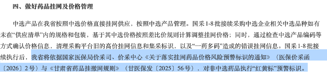 各地发布的非中选药品执行“红黄标”预警标识内容,均指向同一文件,即《关于落实挂网药品价格风险预警标识的通知》(医保价采函〔2026〕2号)。