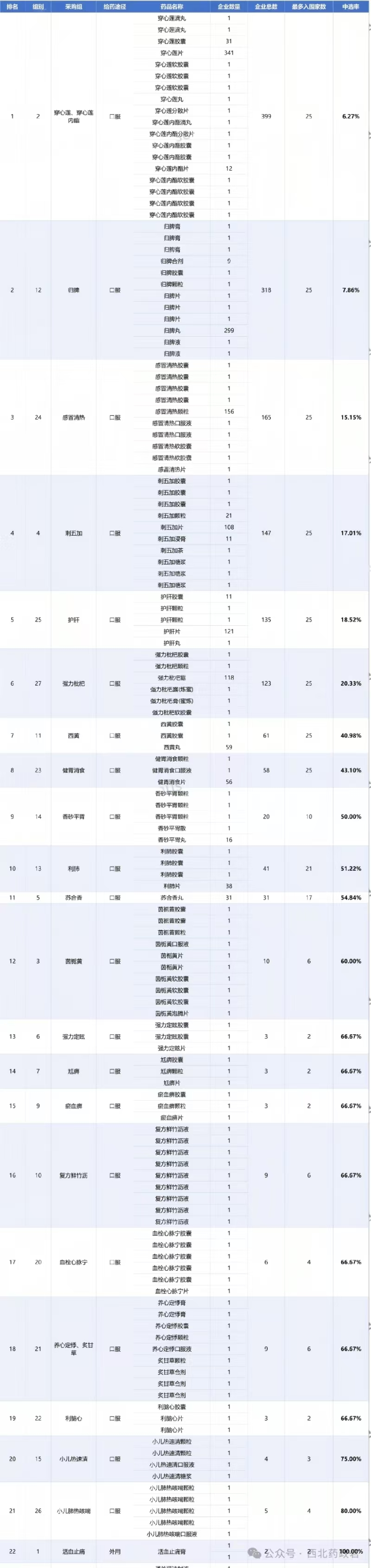 1、反映了中成药行业的现状:集采竞争格局直接映射了中成药市场的同质化程度。像穿心莲、归脾、感冒清热这类经典方剂,技术门槛相对较低,导致大量企业扎堆生产,同质化竞争严重。反之,一些现代中药提取物或复杂制剂,则保持了较好的竞争格局。